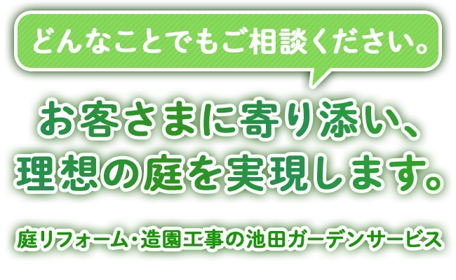 ご相談・お見積もりは無料ですので、お気軽にお問い合わせください。みなさまのお庭に関するお悩みやご要望に、心を込めてお応えします。